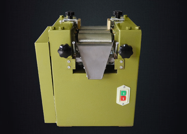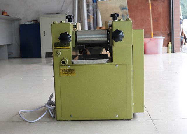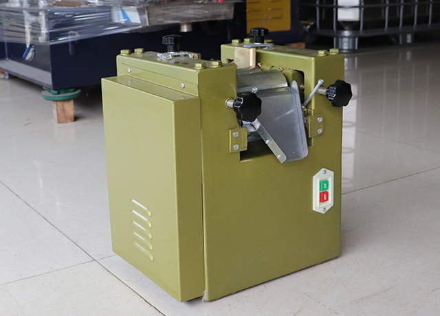 实验室三辊研磨机由三个辊筒组成,装在一个机架上,由电动机直接带动。一般辊筒间的转动方向不同,前辊向前转动,中辊向后转动。辊子转速前辊快、后辊慢。中间辊固定,前后两辊装在滑道上,由弹簧装置,用手轮调节前后辊和中辊的距离。物料由后辊与中辊之间进入,受到辊筒的挤压,产品颗粒变细,然后由快辊带出,快辊末端装有刮刀,使物料与辊筒分离,落入收集桶内。