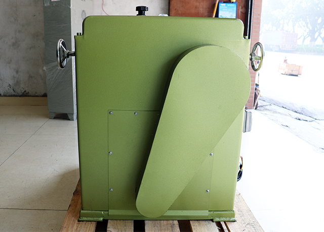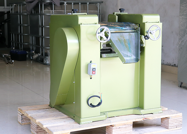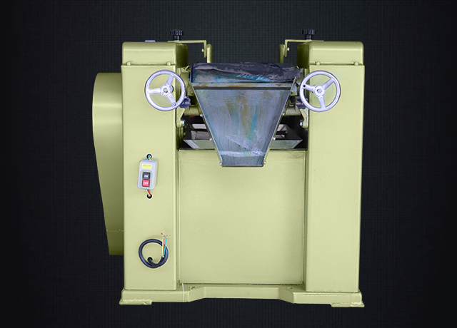 S150三辊研磨机由三个辊筒组成,装在一个机架上,由电动机直接带动。一般辊筒间的转动方向不同,前辊向前转动,中辊向后转动。辊子转速前辊快、后辊慢。中间辊固定,前后两辊装在滑道上,由弹簧装置,用手轮调节前后辊和中辊的距离。物料由后辊与中辊之间进入,受到辊筒的挤压,产品颗粒变细,然后由快辊带出,快辊末端装有刮刀,使物料与辊筒分离,落入收集桶内。