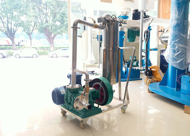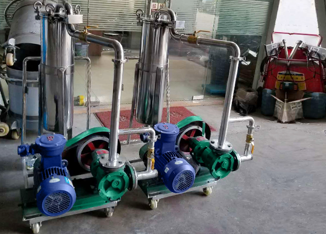 过滤小车包括了一个不锈钢袋式过滤器、气动隔膜泵、气源二联件、单气控阀,装置在不锈钢手推车上。气动隔膜泵将物料从拉缸或者罐体吸入至过滤器外壳的旁侧入口管流入滤袋,过滤掉杂质后的物料泵送至灌装机进行灌装或者进入储罐储存。袋式过滤器是一种压力式过滤装置,主要有过滤筒体、过滤筒盖和快开机构、不锈钢滤袋加强网等主要部件组成,滤液由过滤机外壳的旁侧入口管流入滤袋,滤袋本身是装置在加强网篮内,液体渗透过所需要细度等级的滤袋即能获得合格的滤液,杂质颗粒被滤袋拦截。不锈钢移动小车,带万向脚轮,移动方便。无电火花产生,符合防爆要求。